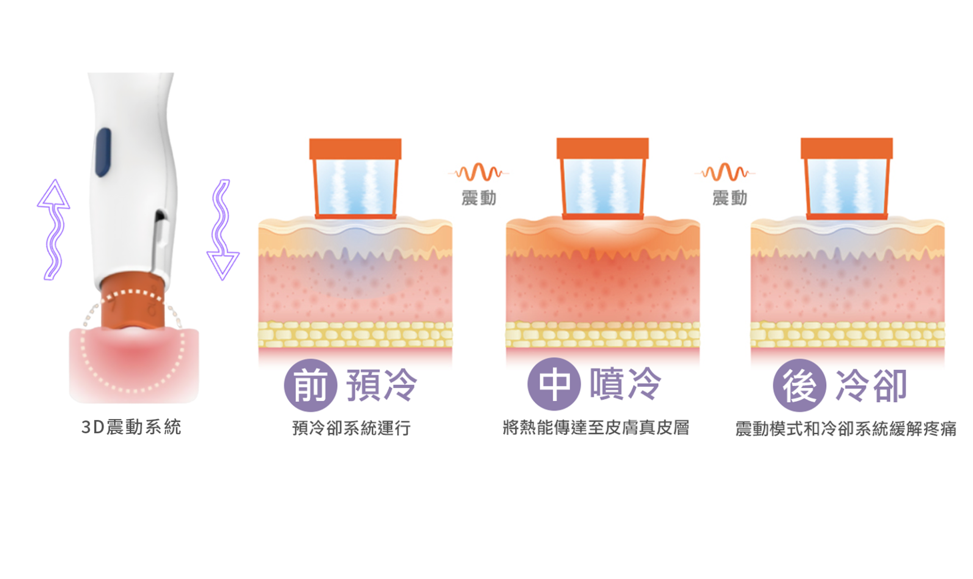 Oligio玩美電波的智能噴冷技術,可根據需求調整冷卻劑量,在五個脈衝能量區間,包含預冷、冷噴、冷卻。探頭接觸皮膚時,利用冷媒進行接觸式冷卻,使肌膚溫度保持在安全範圍,接著進行3D震動系統,藉由神經傳導阻斷原理,降低治療中的痛感,提高療程舒適度。而玩美電波是從探頭正中間冷噴,有著鎮定的果,探頭周圍冷噴也不會有探頭結霜問題。