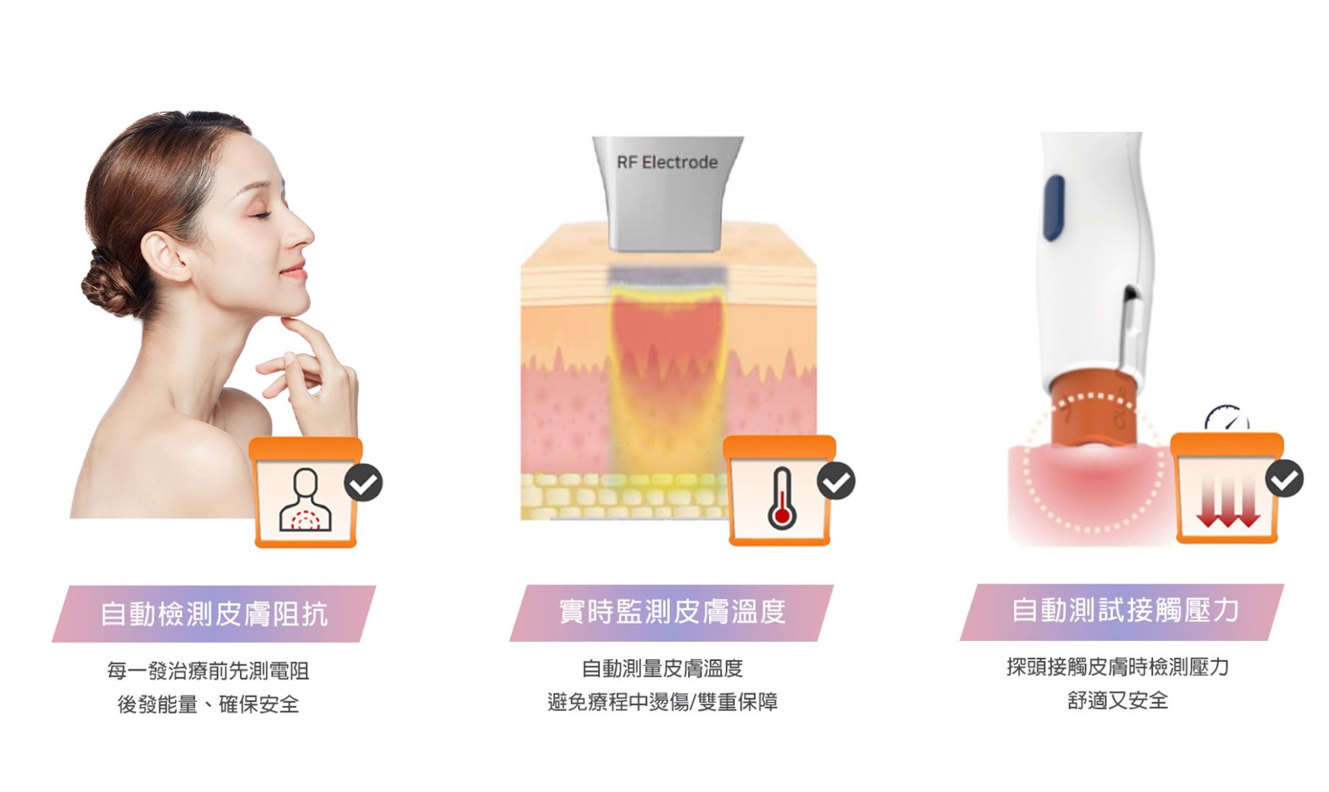 1.自動檢測皮膚電阻:每一發能量輸出前會先檢測皮膚阻抗,精準優化能量,讓電波加熱不受阻抗影響,在安全範圍內輸出,確保治療安全。