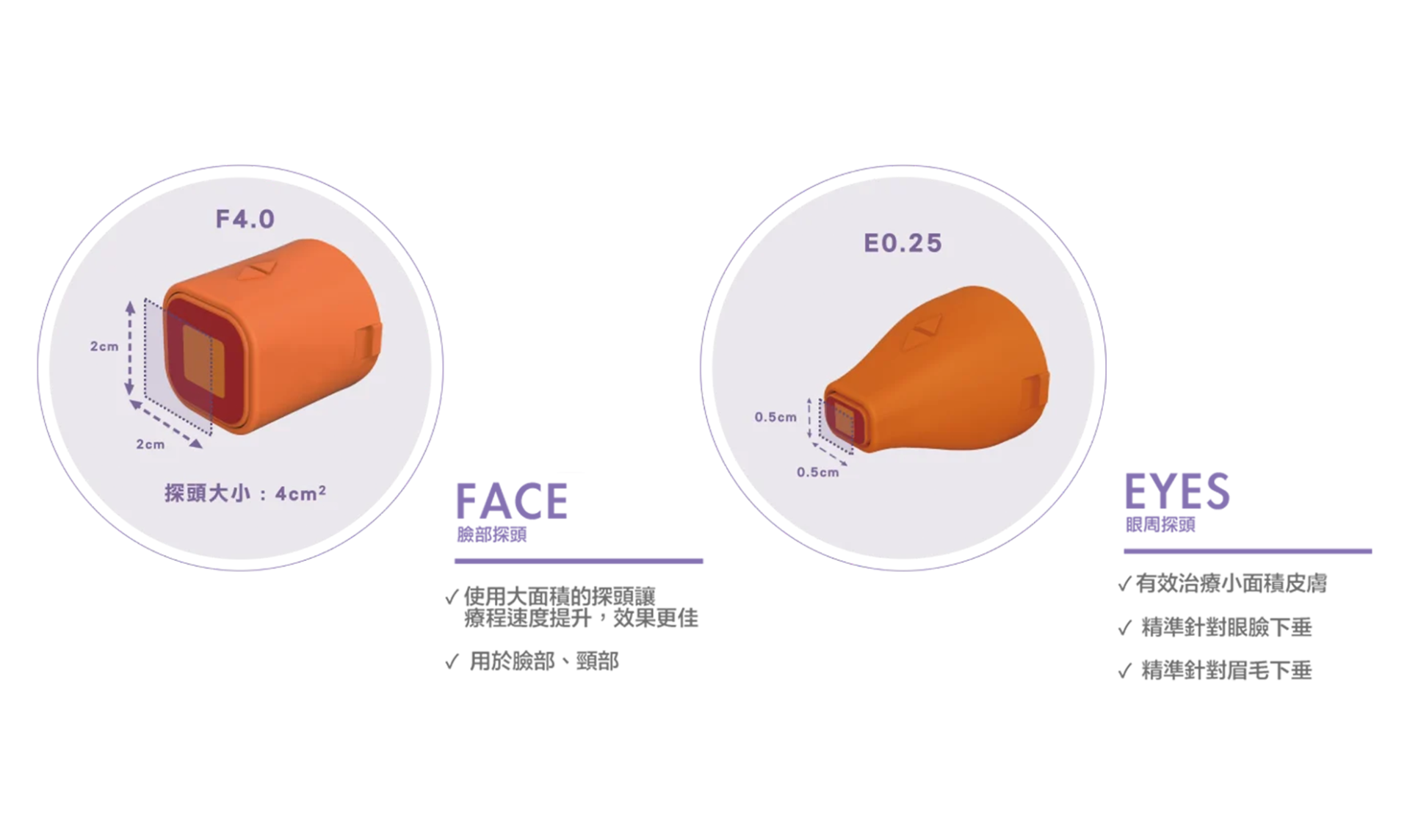 Oligio玩美電波針對亞洲女性臉型、骨骼進行研究,推出更貼合亞洲面部結構的兩大探頭:針對面部大範圍治療的面部探頭F4.0,以及針對眼周治療的眼部探頭E0.25,改善以往電波探頭不服貼問題,讓能量傳遞的更完善全面,緊膚治療皺紋效果更顯著!