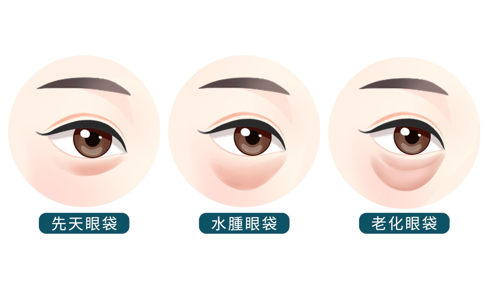 先天型眼袋:天生下眼瞼脂肪較多,青春期就出現眼袋,與家族遺傳高度相關,眼周即使沒有明顯老化,仍會有持續性的眼袋凸出。
