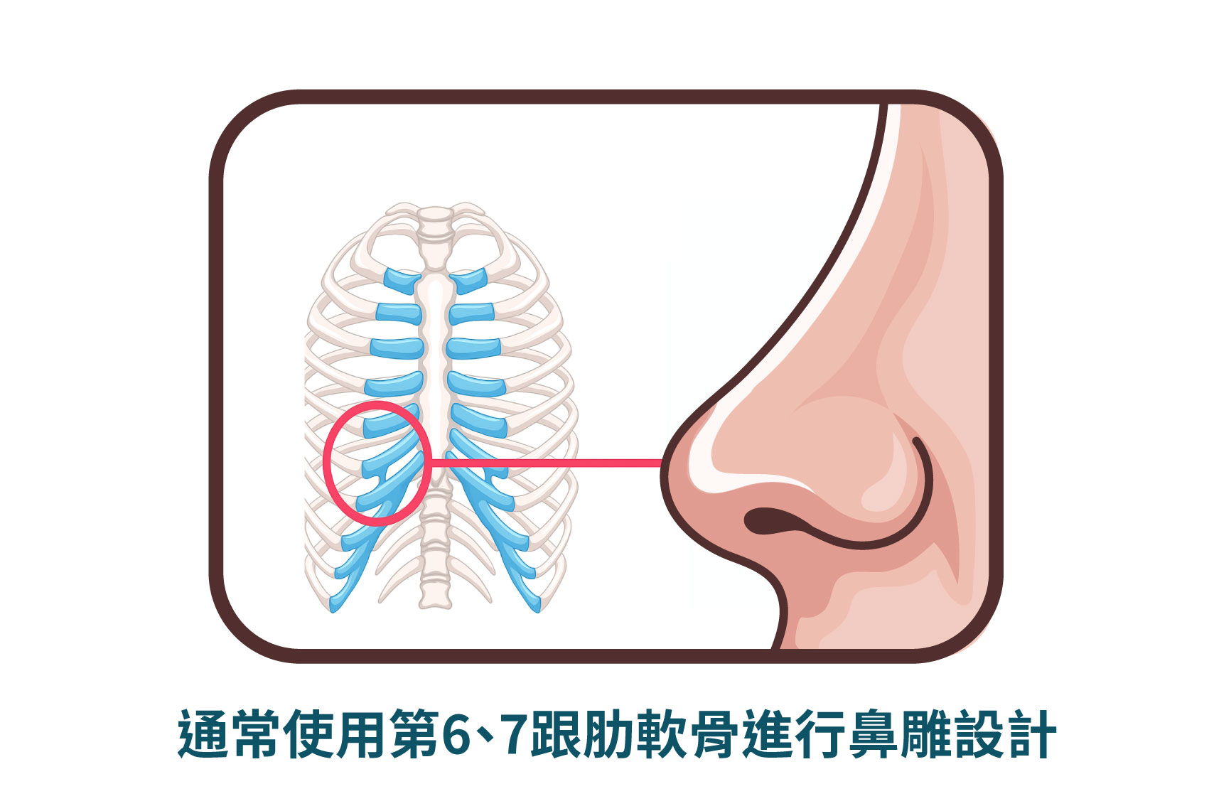 自體肋骨是使用自身軟肋骨作為隆鼻植入物,於右胸下緣處切口(約 2–5cm),取第 6 或第 7 肋骨雕刻成合適形狀與尺寸。相較於人工材料,自體肋軟骨相容性與安全性更佳,不易引起排斥或感染風險。