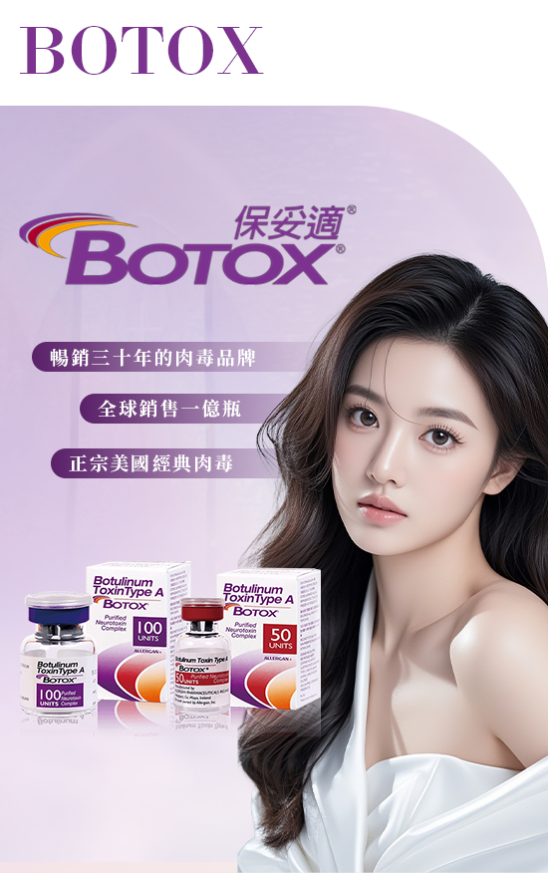 Botox保妥適乾粉注射劑,由美國醫藥大廠愛力根製造研發,為最早被人類廣泛應用的 A 型肉毒桿菌素,可謂開創醫學美容歷史的重要針劑。實際用於臨床的時間相當長,擁有大量臨床醫療案例及文獻期刊佐證。
